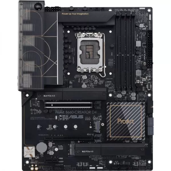Placa de baza Asus ProArt B660-CREATOR D4 LGA 1700 Intel® B660 LGA 1700 ATX motherboard built for creators, with PCIe® 5.0, DDR4, 2.5 Gb and 1 Gb Ethernet, three PCIe 4.0 M.2 slots, plus USB-C DisplayPort™ and a USB 3.2 Gen 2x2 front-panel connector with Quick Charge 4+ Socket LGA 1700 for 12th Gen Intel® Core™, Pentium® Gold and Celeron® processors Comprehensive connectivity: 2.5 Gb & 1 Gb onboard Ethernet, three M.2 slots, ThunderboltTM header support, USB-C DisplayPortTM and a USB 3.2 Gen 2x2 front panel connector with Quick Charge 4+ Next-gen performance: 12+1 power stages rated for 50 amps, PCIe® 5.0 ready Optimized thermal design: A massive VRM and chipset heatsink, aluminum M.2 heatsinks, six 4-pin PWM fan headers and an AIO pump header ProArt gives you more: Two-Way AI Noise Cancelation for clear online communication and ProArt Creator Hub with CreationFirst for one-stop system control Advanced security management: USB port restriction, software blacklisting and Windows Registry protection via ASUS Control Center Express https://www.asus.com/Motherboards-Components/Motherboards/ProArt/ProArt- B660-CREATOR-D4/