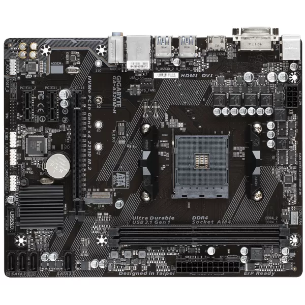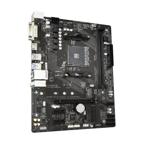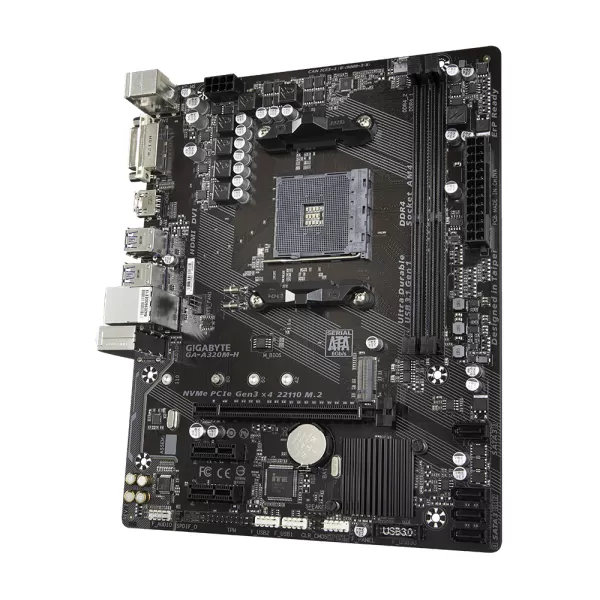 Placa de baza Gigabyte A320M-H 2.0 AM4 CPU AM4 Socket: Supports AMD 3rd Gen Ryzen™/ 2nd Gen Ryzen™/ 1st Gen Ryzen™/ 2nd Gen Ryzen™ with Radeon™ Vega Graphics/ 1st Gen Ryzen™ with Radeon™ Vega Graphics/ Athlon™ with Radeon™ Vega Graphics/ 7th Gen A-series/ Athlon X4 Processors (Please refer "CPU Support List" for more information.) Chipset AMD A320 Memory 2 x DDR4 DIMM sockets supporting up to 64 GB (32 GB single DIMM capacity) of system memory Dual channel memory architecture Support for DDR4 3200(O.C.)/2933(O.C.)/2667*/2400/2133 MHz memory modules * Actual support may vary by CPU. Support for ECC Un-buffered DIMM 1Rx8/2Rx8 memory modules (operate in non-ECC mode) Support for non-ECC Un-buffered DIMM 1Rx8/2Rx8/1Rx16 memory modules Support for Extreme Memory Profile (XMP) memory modules (Please refer "Memory Support List" for more information.) Onboard Graphics Integrated Graphics Processor: 1 x DVI-D port, supporting a maximum resolution of 1920x1200@60 Hz * The DVI-D port does not support D-Sub connection by adapter. 1 x HDMI port, supporting a maximum resolution of 4096x2160@24 Hz * Support for HDMI 1.4 version. Maximum shared memory of 2 GB * Actual support may vary by CPU. Audio Realtek® audio codec High Definition Audio 2/4/5.1/7.1-channel * To configure 7.1-channel audio, you need to open the audio software and select Device advanced settings > Playback Device to change the default setting first. Please visit GIGABYTE's website for details on configuring the audio software. Support for S/PDIF Out https://www.gigabyte.com/Motherboard/GA-A320M-H-rev-20/sp#sp