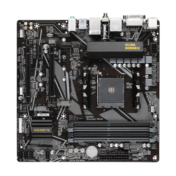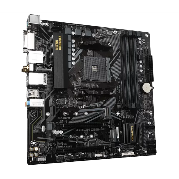 Placa de baza Gigabyte B550M DS3H AC AM4 DDR4, 4x sloturi RAM, max. 128GB, frecventa maxima suportata 4733MHz, 1x DVI-D, 1x HDMI, 2x PCIe x16, 1x PCIe x1, 2x M.2, 4x conectori SATA 6GB/s, 1x LAN 1Gbps, WIFI, Bluetooth 4.2, microATX