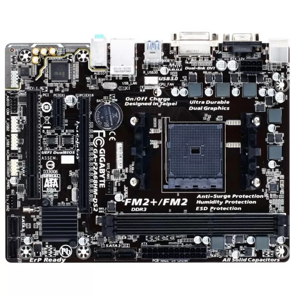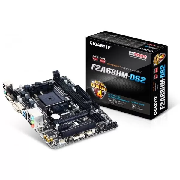 Placa de baza Gigabyte Socket FM2+, F2A68HM-DS2, AMD A68H, 2*DDR3 2400 (OC)/2133/1866/1600/1333, DVI, VGA, 1*PCIEx16, 1*PCIEx2.0, 1*PCIEx, 4 *SATA3, 2*USB3.0, 8*USB2.0, 8CH, Gigabyt LAN, mATX