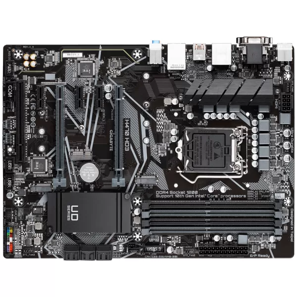 Placa de baza Gigabyte H470 HD3 Socket LGA 1200 Intel® H470 Ultra Durable Motherboard with Dual NVMe PCIe Gen3 X4 M.2 Slots, 2-Way CrossFire™ Multi-Graphics, Intel® GbE with cFosSpeed, USB 3.2 Gen1 Type-C™, Q-Flash Plus , Smart Fan 5, RGB FUSION 2.0 ,M.2 E-key Slot for CNVi WIFI Module Upgradable Supports 10th Gen Intel® Core™ Series Processors Dual Channel Non-ECC Unbuffered DDR4, 4 DIMMs Dual NVMe PCIe Gen3 X4 M.2 Connectors Smart Fan 5 Features Multiple Temperature Sensors,Hybrid Fan Headers with FAN STOP Intel® Optane™ Memory Ready Intel® GbE LAN with cFosSpeed Internet Accelerator Software Intel® USB 3.2 Gen 1 Type-C™ Support 3 Display Interfaces Support M.2 E-key Slot for PCIe WIFI Module Upgradable Anti-Sulfur Resistors Design RGB FUSION 2.0 with Multi-Zone Addressable LED Light Show Design, Support Addressable LED & RGB LED Strips Q-Flash Plus Update BIOS without Installing the CPU、Memory and Graphics Card https://www.gigabyte.com/us/Motherboard/H470-HD3-rev-10#kf