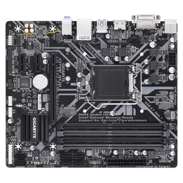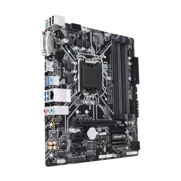 Placa de baza Gigabyte Z370M DS3H, Socket 1151, Intel® Z370 Express Chipset, Dual channel memory: 4* DDR4 DIMM, DDR4 3866(O.C.) / 3800 (O.C.) / 3733(O.C.) / 3666(O.C.) / 3600(O.C.) / 3466(O.C.) / 3400(O.C.) / 3333(O.C.) / 3300(O.C.) / 3200(O.C.) / 3000(O.C.) / 2800(O.C.) / 2666 / 2400 / 2133 MHz memory modules, 1* PCI Express x16, 2* PCI Express x1, 6* SATA 6Gb/s connectors, 6* USB 3.1, 6* USB 2.0/1.1, 1* DVI-D/HDMI, 1* RJ-45 port, Micro ATX