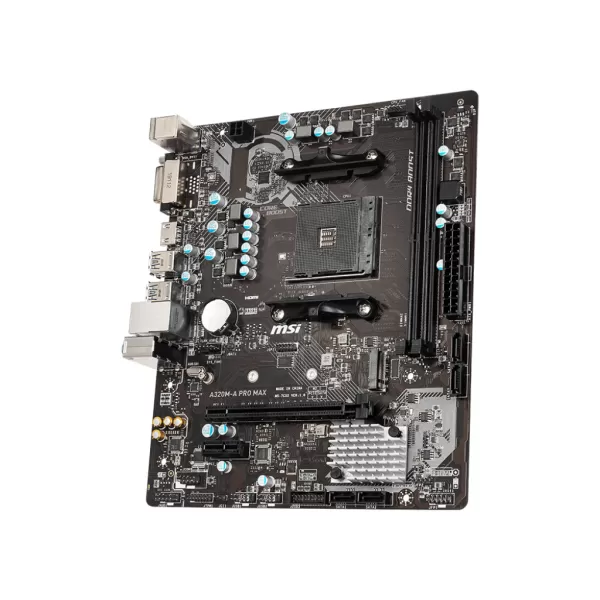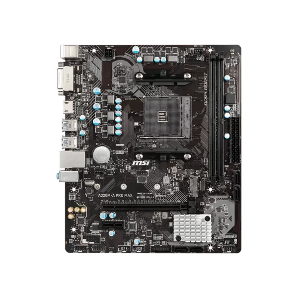 Placa de baza MSI Socket AM4, A320M-A PRO MAX, DDR4 Memory: 1866/ 2133/ 2400/ 2667/ 2933(OC)/ 3200(OC)+ MHz, 2x Memory Channel, 2x DIMM Slots, 1x PCI-E x16, 1x PCI-E Gen, 1x PCI-E x1, 4x SATA III, 1x TPM, 6x USB 3.2, 6x USB 2.0, 1x Serial Port, 1x Audio Port, 1x DVI-D, 1x HDMI, m-ATX Form.