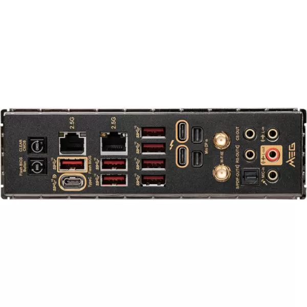 Placa de baza MSI MEG Z690 ACE DDR5 LGA 1700 4719072886493 SPECIFICATIONS Model Name MEG Z690 ACE CPU Support Supports 12th Gen Intel® Core™ Processors, Pentium® Gold and Celeron® Processors CPU Socket LGA 1700 Chipset Intel® Z690 Chipset Graphics Interface 2x PCIe 5.0 x16 slots 1x PCIe 4.0 x16 slot AMD® CrossFire™ Technology Display Interface 1x Type-C Display port – Requires Processor Graphics 2x Thunderbolt™ 4 (Type-C) – Input from mini DisplayPort Memory Support 4 DIMMs, Dual Channel DDR5-6666+MHz (OC) Storage 4x M.2 Gen4 x4 64Gbps slots, 1x M.2 Gen3 x4 32Gbps slot, 6x SATA 6Gb/s ports Thunderbolt™ 4 2x USB Type-C up to 40G, Charging support up to 5V/3A, 15W 2x Mini DisplayPort input ports USB ports 2x USB 3.2 Gen 2x2 20Gbps (2 Type-C), 8x USB 3.2 Gen 2 10Gbps (7 Type-A + 1 Type-C), 4x USB 3.2 Gen 1 5Gbps (4 Type-A), 4x USB 2.0 LAN 2x Intel® I225-V 2.5G LAN WiFi / BT Intel® Wi-Fi 6E module, Bluetooth 5.2 Audio 8-Channel (7.1) HD Audio with Audio Boost 5 HD https://www.msi.com/Motherboard/MEG-Z690-ACE/Specification