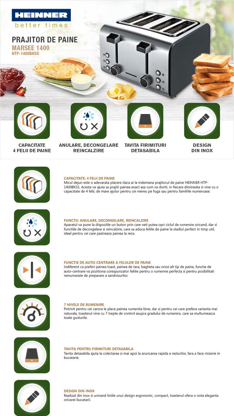 | Caracteristici Prajitor de paine Heinner HTP-1400BKSS, 1600W, Argintiu: | |