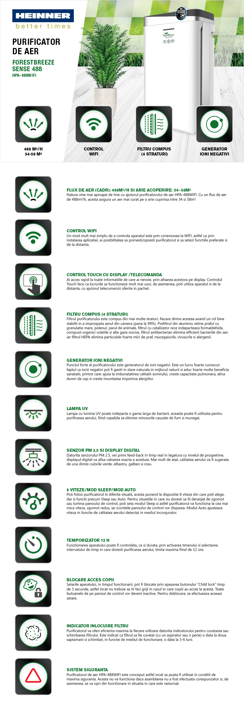 | Caracteristici Purificator de aer Heinner HPA-488WIFI: | |