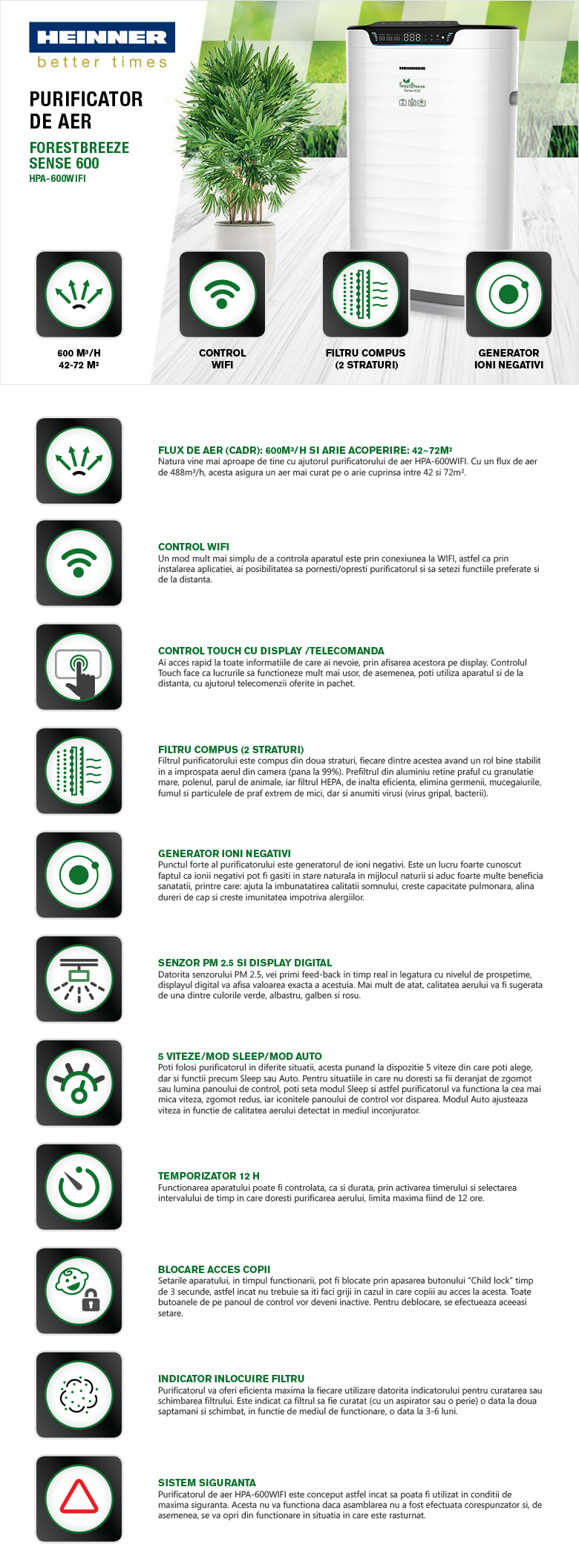 | Caracteristici Purificator de aer Heinner HPA-600WIFI: | |