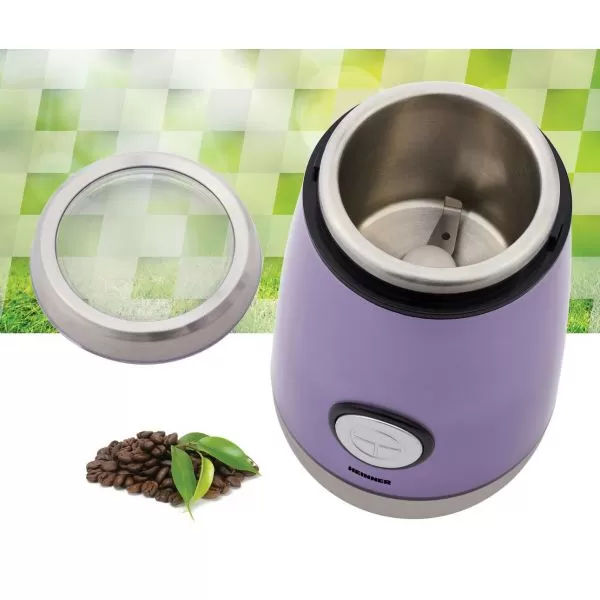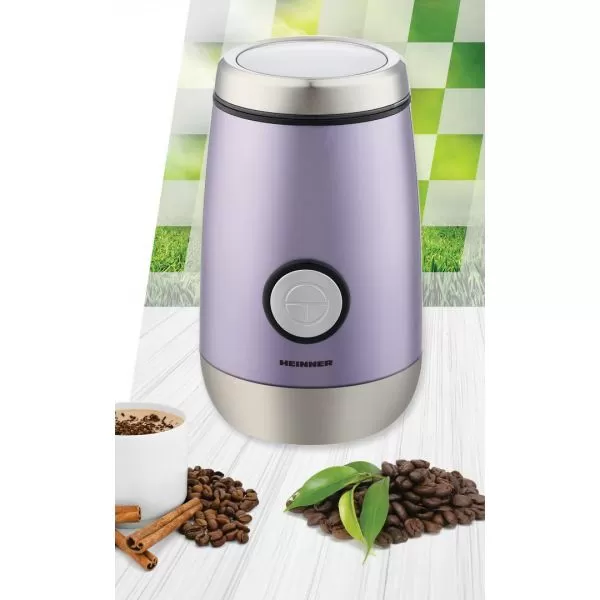 Rasnita electrica HEINNER HCG-150MOV, catacitate 50g, putere 150w, interior din inox, lamne din inox, sisdtem de siguranta, buton ON/OFF, mov sidefat