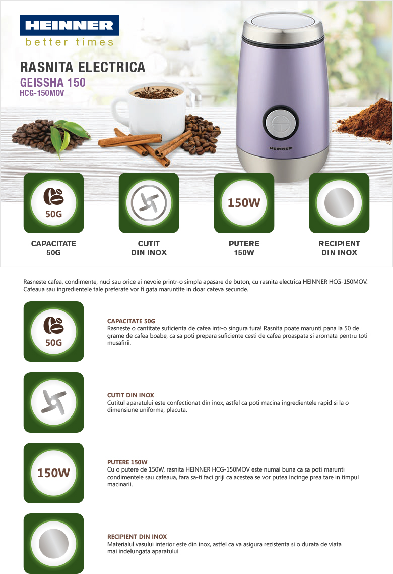 | Caracteristici Rasnita electrica Heinner HCG-150MOV, 150W, 50g, Mov: | |