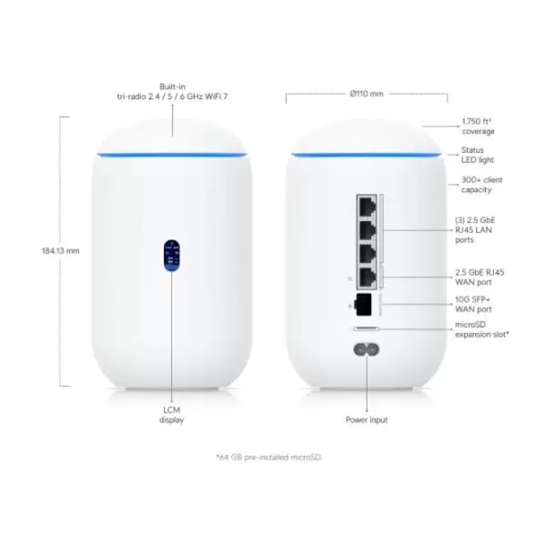 Ubiquiti UniFi UDR7-EU Dream Router 7 Desktop 10G Cloud Gateway with integrated WiFi 7, PoE switch, microSD storage, and full UniFi application support, 10G SFP+ and (1) 2.5 GbE RJ45 WAN port, 64 GB microSD,