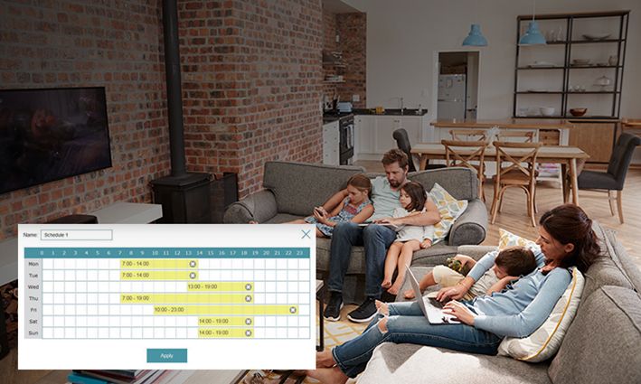 ![]() Control parental si planificare Functia de control parental poate fi utilizata pentru a restrictiona accesul la retea pentru dispozitivele client. De asemenea, pot fi programate setari pentru a permite accesul dispozitivelor client la intreaga retea de domiciliu in anumite momente. |