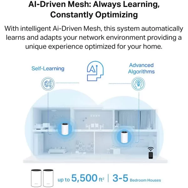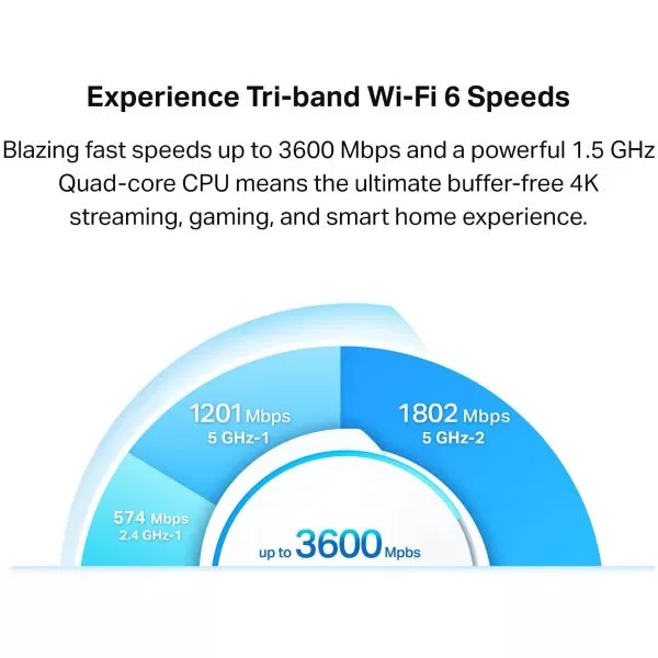 TP-Link AX3600 whole home mesh Wi-Fi 6 System, Deco X68(2-pack);IEEE 802.11ax/ac/n/a 5 GHz, IEEE 802.11ax/n/b/g 2.4 GHz, WiFi Speeds: 5 GHz: 1802 Mbps, 5 GHz: 1201 Mbps, 2.4 GHz: 574 Mbps, 5 × Antene High-Gain, Tri-Band, 3 × 3 MU-MIMO, 1.5 GHz Quad-Core CPU, 2 × Porturi Gigabit.