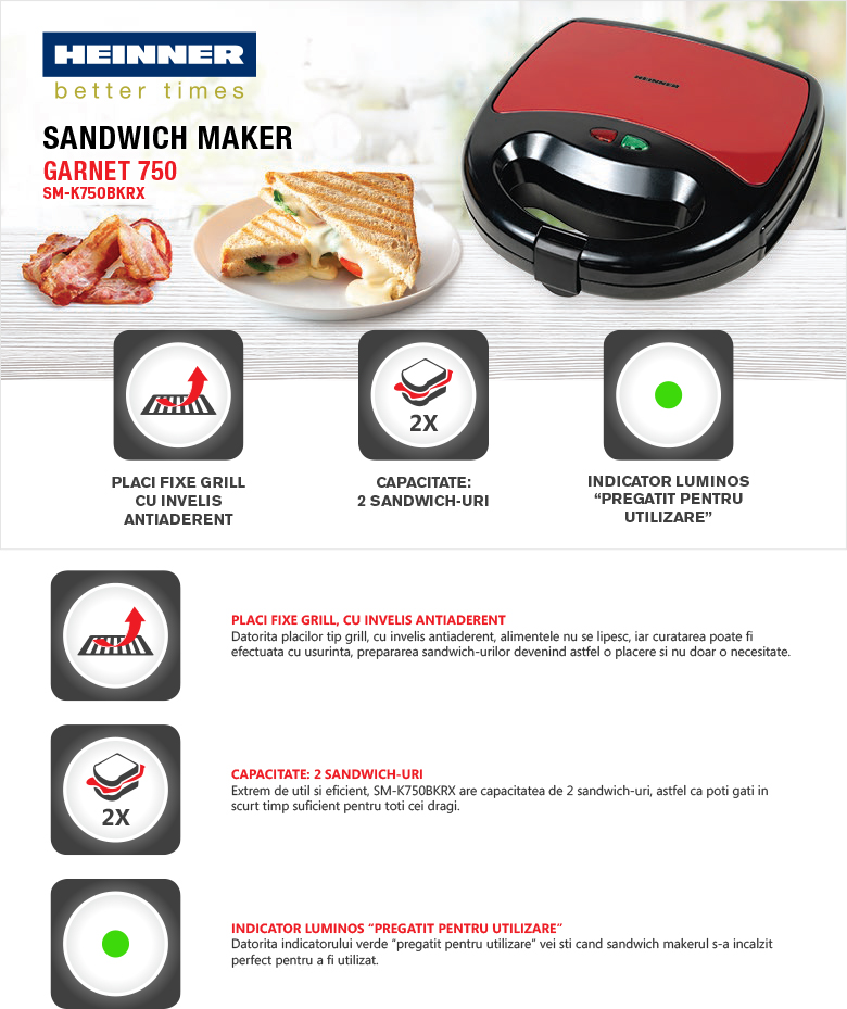 | Caracteristici Sandwich maker Heinner Garnet 750 SM-K750BKRX, 750W, Negru/Rosu: | |