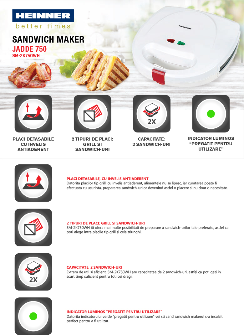| Caracteristici Sandwich maker Heinner Jadde 750 SM-2K750WH, 750W, Alb: | |