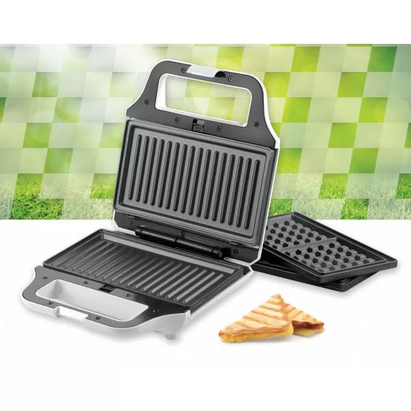 Sandwich maker Heinner SM-2H700WH, placi detasabile anti-adezive, 2 tipuri de placi: grill & waffle, capacitate 2 sandwich-uri, indicator luminos "gata de folosire", indicator luminos alimentare, dimensiuni placi: 22.3 x 12.5 cm, maner rece, putere: 700W, alb