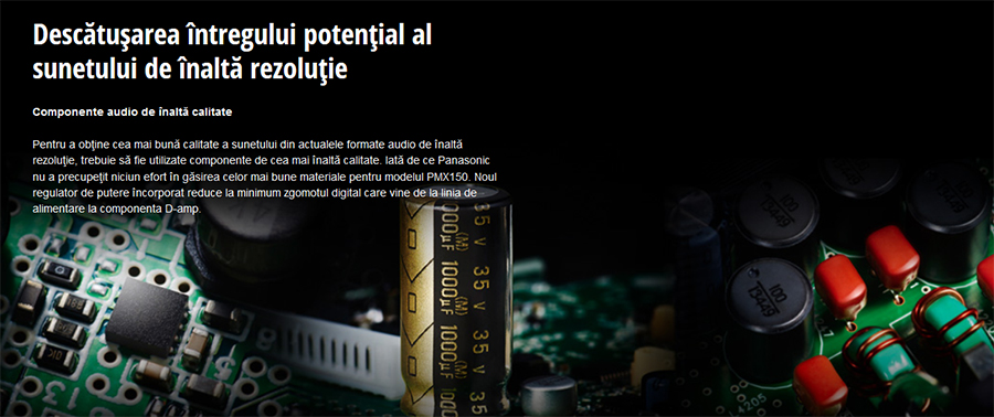 Pentru a ob?ine cea mai bun? calitate a sunetului din actualele formate audio de înalt? rezolu?ie, trebuie s? fie utilizate componente de cea mai înalt? calitate. Iat? de ce Panasonic nu a precupe?it niciun efort în g?sirea celor mai bune materiale pentru modelul PMX150. Noul regulator de putere încorporat reduce la minimum zgomotul digital care vine de la linia de alimentare la componenta D-amp.