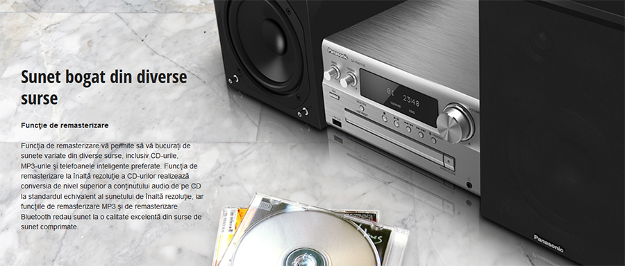 Func?ia de remasterizare v? permite s? v? bucura?i de sunete variate din diverse surse, inclusiv CD-urile, MP3-urile ?i telefoanele inteligente preferate. Func?ia de remasterizare la înalt? rezolu?ie a CD-urilor realizeaz? conversia de nivel superior a con?inutului audio de pe CD la standardul echivalent al sunetului de înalt? rezolu?ie, iar func?iile de remasterizare MP3 ?i de remasterizare Bluetooth redau sunet la o calitate excelent? din surse de sunet comprimate.