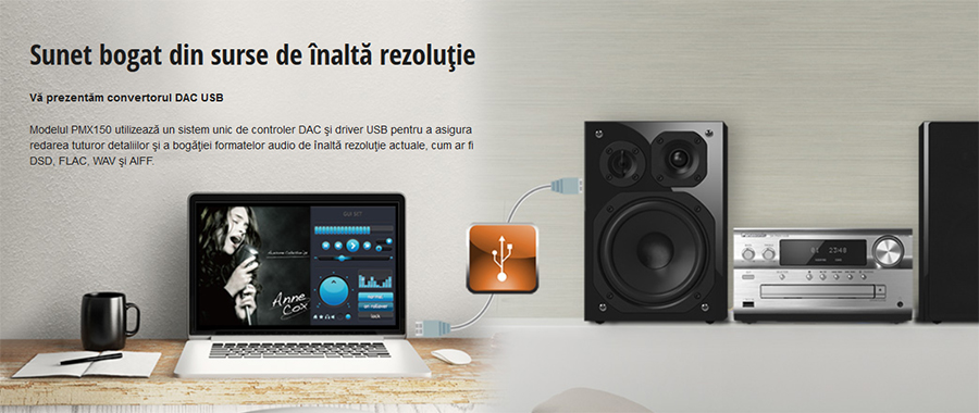 Modelul PMX150 utilizeaz? un sistem unic de controler DAC ?i driver USB pentru a asigura redarea tuturor detaliilor ?i a bog??iei formatelor audio de înalt? rezolu?ie actuale, cum ar fi DSD, FLAC, WAV ?i AIFF.