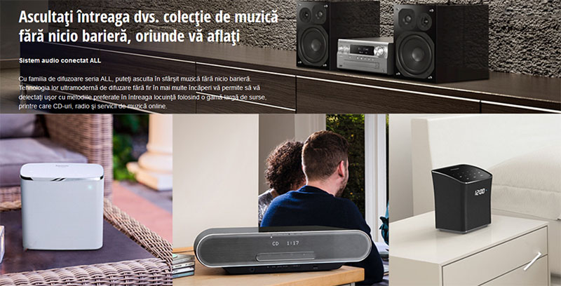 Cu familia de difuzoare seria ALL, pute?i asculta în sfâr?it muzic? f?r? nicio barier?. Tehnologia lor ultramodern? de difuzare f?r? fir în mai multe înc?peri v? permite s? v? delecta?i u?or cu melodiile preferate în întreaga locuin?? folosind o gam? larg? de surse, printre care CD-uri, radio ?i servicii de muzic? online.