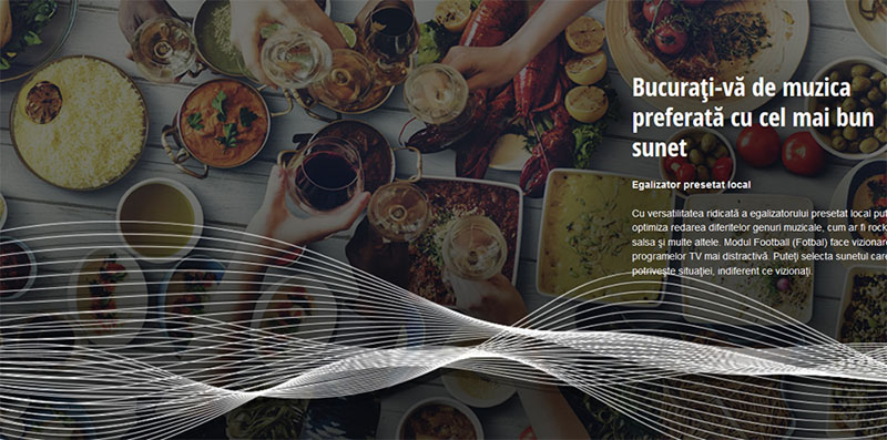Cu versatilitatea ridicata a egalizatorului presetat local puteti optimiza redarea diferitelor genuri muzicale, cum ar fi rock, salsa si multe altele. Modul Football (Fotbal) face vizionarea programelor TV mai distractiva. Puteti selecta sunetul care se potriveste situatiei, indiferent ce vizionati.