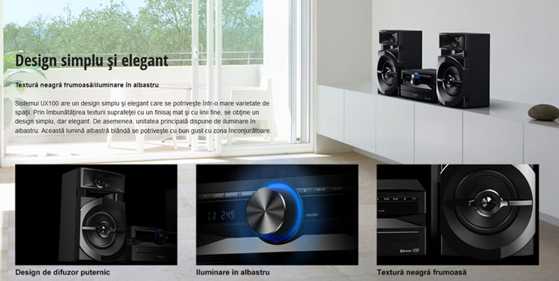 Sistemul UX100 are un design simplu si elegant care se potriveste intr-o mare varietate de spatii. Prin imbunatatirea texturii suprafetei cu un finisaj mat si cu linii fine, se obtine un design simplu, dar elegant. De asemenea, unitatea principala dispune de iluminare in albastru. Aceasta lumina albastra blanda se potriveste cu bun gust cu zona inconjuratoare.