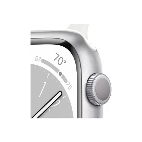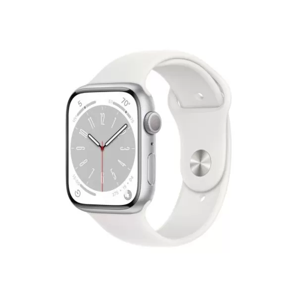 Apple Watch 8 GPS, 45mm Silver Aluminium Case, White Sport Band