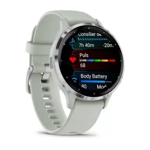 Ceas smartwatch Garmin Venu 3S, display AMOLED, dimensiune afisaj 30.4 mm, rezolutie afisaj 390 x 390 pixeli, memorie 8GB, autonomie pana la 10 zile, rezistanta la apa pana la 5 ATM, ramă argintie din oţel inoxidabil şi carcasă sage grey şi brăţară din silicon, greutate: 40g