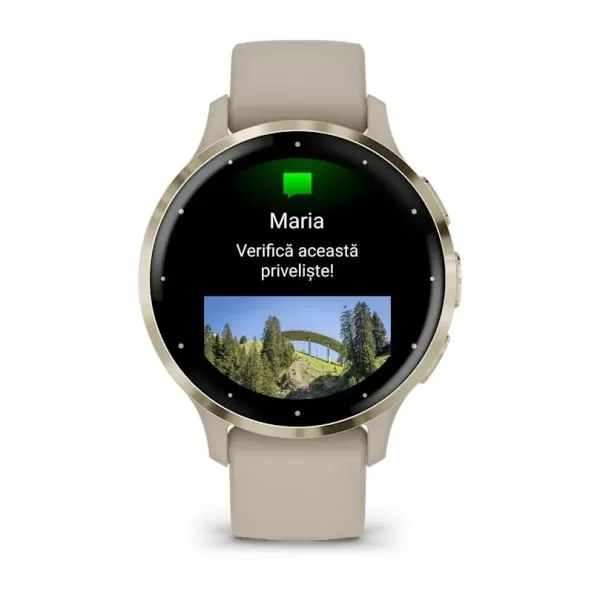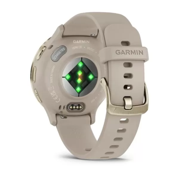 Ceas smartwach Garmin Venu 3S display AMOLED, dimensiune afisaj 30.4 mm, rezolutie afisaj 390 x 390 pixeli, memorie 8GB, autonomie pana la 10 zile, rezistanta la apa pana la 5 ATM, ramă din oţel inoxidabil Soft Gold cu carcasă French Gray şi curea din silicon, greutate: 40g