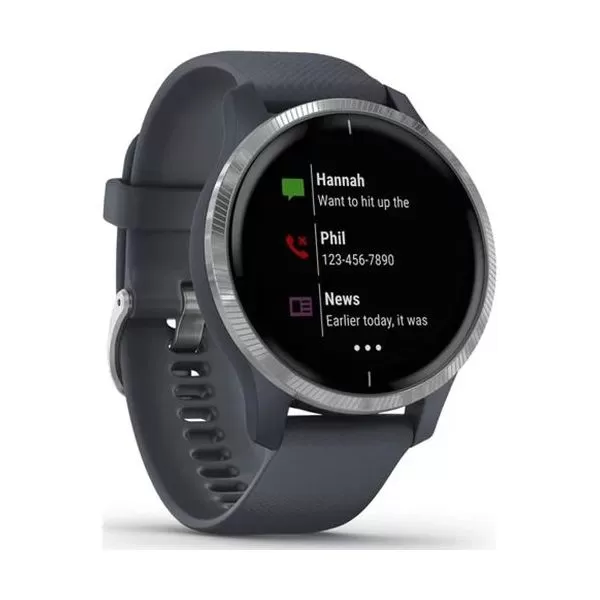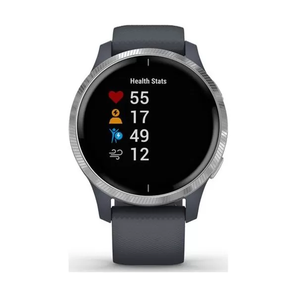 SMART WATCH GARMIN VENU Blue Granite/Silver SEU, Smart notifications, Music player controls and storage, Garmin pay contactless, Body battery energy monitoring, Pulse Ox sensor, GPS, AMOLED display, Battery life: Up to 5 days (Smartwatch mode) Up to 6 hours (GPS + music mode), Water rating: SWIM, 5 ATM.