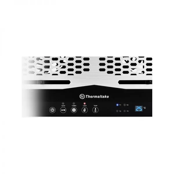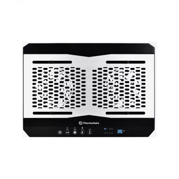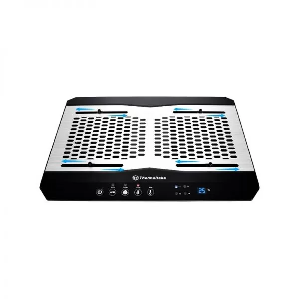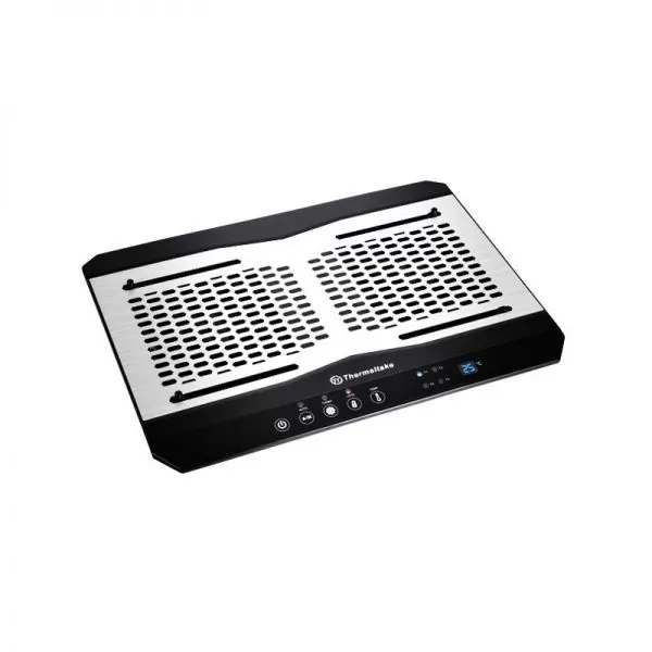 Stand/Cooler notebook Thermaltake Massive TM, structura din plastic si aluminiu, dimensiune notebook: 10” - 17” (maxim), doua ventilatoare silentioase de 120mm cu control termic automat/manual (1000 RPM / Turbo 1300 RPM, 61.27 CFM, 1.59 mm-H2O, max 31 dBA, display/control panel, senzori de temperatura), alimentare de la portul USB, dimensiuni: 390 x 277.5 x 49.3 mm, greutate: 830g
