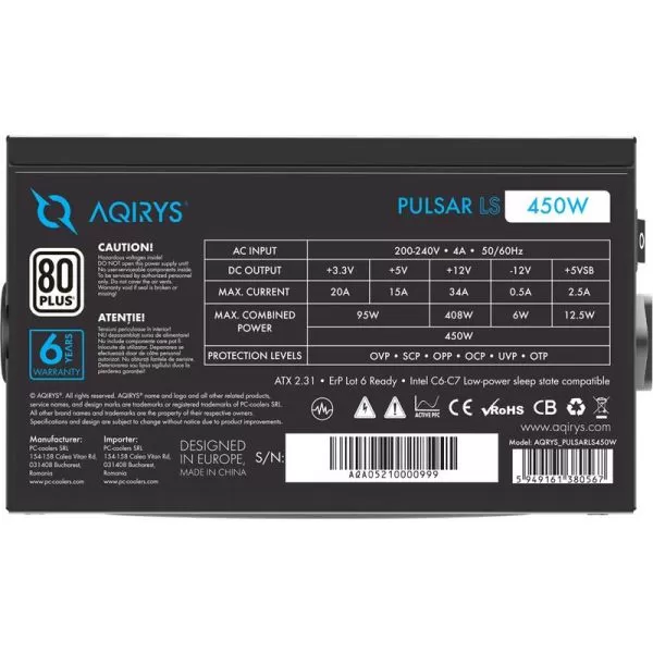 Sursa Aqirys Pulsar LS 450W 80+ White certified, culoare neagra TECHNICAL DATA Continuous power: 450W Form factor: Intel® ATX12V 2.31 Efficiency: 80PLUS® White certified Intel® C6/C7: Yes PFC: Active Illumination: No Modular cables: No Cable type: Flat, black Fan size: 120 mm Fan speed: Temperature controlled Fan technology: Fluid Dynamic Bearing AC Input: 200 - 240V, 4A, 50/60Hz DC Output +3.3V: 20A DC Output +5V: 15A DC Output +12V1: 34A DC Output -12V: 0.5A DC Output +5Vsb: 2.5A MB connector: 1x 20+4P CPU connector: 1x 8P, 1x 4+4P PCIe connector: 2x 6+2P SATA connector: 4x Molex connector: 2x 4P Protections: OVP, OCP, OPP, SCP, UVP, OTP Environmental compliance: RoHS, WEEE, ErP Lot 6 Dimensions (LxWxH): 140 x 150 x 87 mm Weight: 1312 g Color: Black EAN: 5949161380567 https://www.aqirys.com/product/pulsar-ls-450w