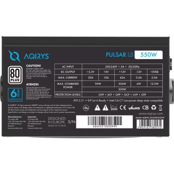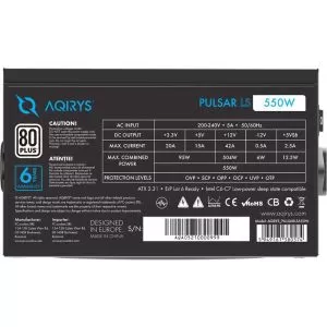 Sursa Aqirys Pulsar LS 550W 80+ White certified, culoare neagra TECHNICAL DATA Continuous power: 550W Form factor: Intel® ATX12V 2.31 Efficiency: 80PLUS® White certified Intel® C6/C7: Yes PFC: Active Illumination: No Modular cables: No Cable type: Flat, black Fan size: 120 mm Fan speed: Temperature controlled Fan technology: Fluid Dynamic Bearing AC Input: 200 - 240V, 4A, 50/60Hz DC Output +3.3V: 20A DC Output +5V: 15A DC Output +12V1: 42A DC Output -12V: 0.5A DC Output +5Vsb: 2.5A MB connector: 1x 20+4P CPU connector: 1x 8P, 1x 4+4P PCIe connector: 2x 6+2P SATA connector: 4x Molex connector: 2x 4P Protections: OVP, OCP, OPP, SCP, UVP, OTP Environmental compliance: RoHS, WEEE, ErP Lot 6 Dimensions (LxWxH): 140 x 150 x 87 mm Weight: 1418 g Color: Black EAN: 5949161380574 https://www.aqirys.com/product/pulsar-ls-550w
