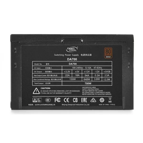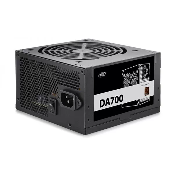 Deepcool DA700 700W PSU, certificata 80 PLUS Bronze, eficienta 85%, single rail (54A), ventilator silentios de 140mm cu control termic automat, 4x 6+2pin PCIE, 5x SATA, 3x Molex, 1x 4+4pin EPS12V, OVP/SCP/OTP/UVP/OPP, Active PFC, dimensiuni: 150 x 160 x 86mm