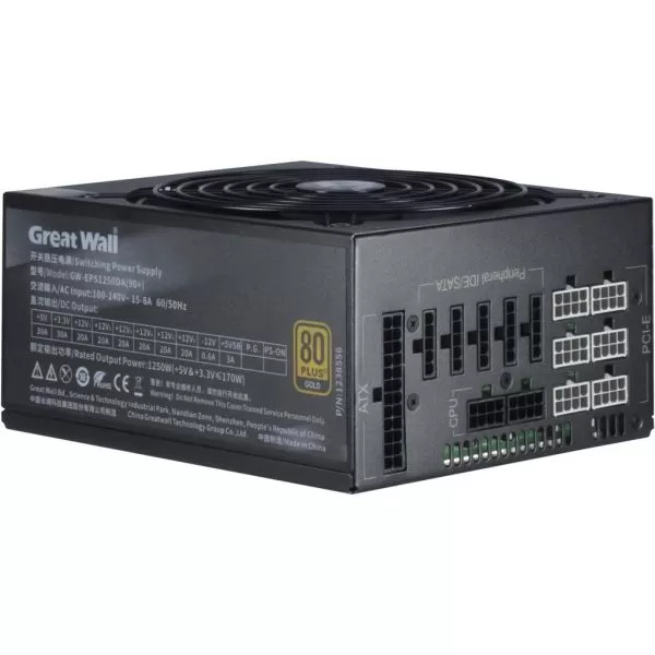 Great Wall GW-M1200 1250W Full Modular PSU, certificata 80 PLUS Gold, eficienta max. 91.26%, hex rail (6 rail-uri de 20A), ventilator silentios de 140mm cu control termic automat, 1x 20+4 pin, 12x 6+2pin PCIE, 7x SATA, 6x Molex, 2x 4+4pin EPS12V, OVP/OCP/SCP, Active PFC, dimensiuni (WxHxD): 175x86x150mm