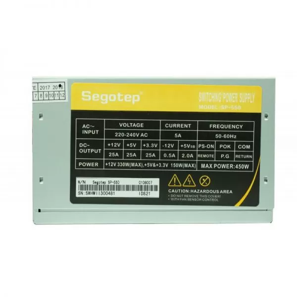Segotep SP-550 450W PSU, certificata 80+, ventilator silentios de 120mm cu control termic automat, 2x SATA, 2x Molex, 1x Floppy, 1x EPS12V 4pin (37cm lungime), 1x 20+4 pin (33m lungime), OVP/OCP/LVP/SCP/OHP/OLP
