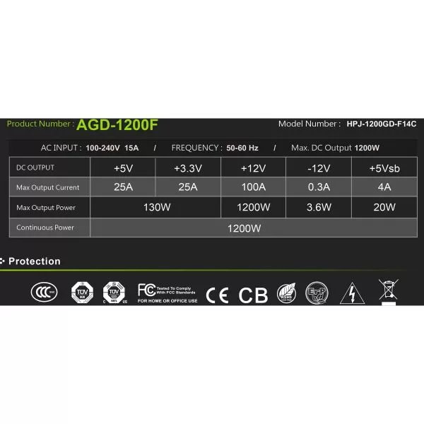1200W | Astro Series AGD-1200F | ATX 2.3 | certificare 80+ Gold | ventilator 135 mm | 12V single-rail | PFC activ | modulara | 1x ATX 24p, 2x ATX 12V/EPS12V, 8x PCIe 8p, 5x HDD, 15x SATA