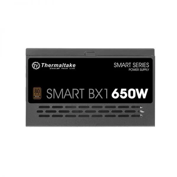 Thermaltake Smart BX1 650W PSU, certificata 80 PLUS Bronze, eficienta pan la 88%, single rail (48A), ventilator silentios de 120mm cu control termic automat, 2x 6+2pin PCIE(650mm), 6x SATA, 4x Molex, 1x Floppy(adaptor), 1x 4+4pin EPS12V(650mm), 1x 24pin(600mm), OVP/OPP/SCP, Active PFC, dimensiuni (H x W x D): 86x150x140mm