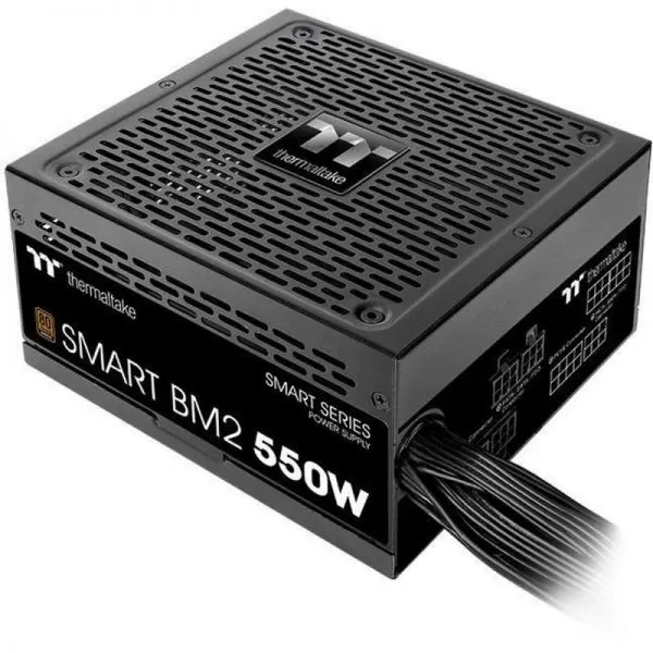 Sursa modulara Thermaltake Smart BM2 550W, certificata 80 PLUS Bronze, eficienta pan la 85%, single rail (45.5A), ventilator silentios de 140mm cu control termic automat, 2x 6+2pin PCIE(650mm), 6x SATA, 4x Molex, 1x Floppy(adaptor), 1x 8pin EPS 12V (600mm) + 1x 4+4pin EPS12V(150mm), 1x 24pin(600mm), OVP/OPP/SCP, Active PFC, dimensiuni (H x W x D): 86x150x160mm