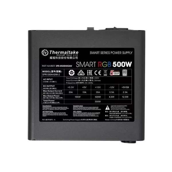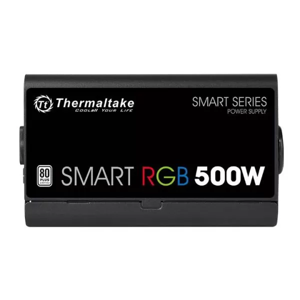 Thermaltake Smart RGB 500W PSU, certificata 80 PLUS, eficienta 82-86%, single rail (35A), ventilator silentios de 120mm cu control termic automat, buton pentru contolul culorii de iluminare a ventilatorului (Red/Green/Blue/Yellow/Purple/Light Blue/White, 256 Color RGB Cycle, Solid Red/Green/Blue/Yellow/Purple/Light Blue/White, and a LED Off mode), 2x 6+2pin PCIE, 5x SATA, 4x Molex, 1x Floppy, 1x 4+4pin EPS12V, OVP/OPP/SCP, Active PFC, dimensiuni (H x W x D): 86x150x140mm