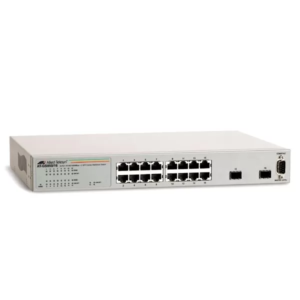 The WebSmart AT-GS950/16 features a Web-based interface that allows you to set up 802.1Q VLANs to segregate traffic, QoS to prioritize mission-critical data such as voice or video packets, and link aggregation to create traffic pipelines. The AT-GS950/16 also provides network monitoring tools such as port mirroring and basic port statistics. Remote product management enables simple monitoring from anywhere you have connectivity. This WebSmart switch provides managed features for simple QoS applications, 16 10/100/1000T ports and two combo SFP ports for Gigabit connections.
