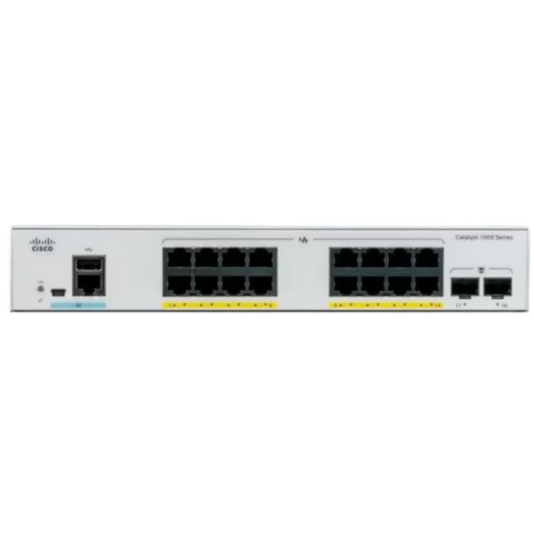 Cisco Catalyst C1000-16FP-2G-L. Switch type: Managed, Switch layer: L2. Basic switching RJ-45 Ethernet ports type: Gigabit Ethernet (10/100/1000), Basic switching RJ-45 Ethernet ports quantity: 16, Installed SFP modules quantity: 2, USB 2.0 ports quantity: 1, Console port: RJ-45/Mini-USB. MAC address table: 15360 entries, Switching capacity: 36 Gbit/s. Networking standards: IEEE 802.1AX,IEEE 802.1D,IEEE 802.1Q,IEEE 802.1ab,IEEE 802.1p,IEEE 802.1s,IEEE 802.1w,IEEE.... Power over Ethernet (PoE)