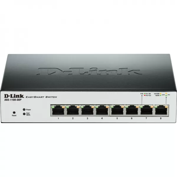 D-Link, Switch Desktop / Rack mount 8 porturi 10/100/1000, EasySmart, Web Management, Fanless, PoE, Switch Capacity 16Gbps, PoE Budget 64W