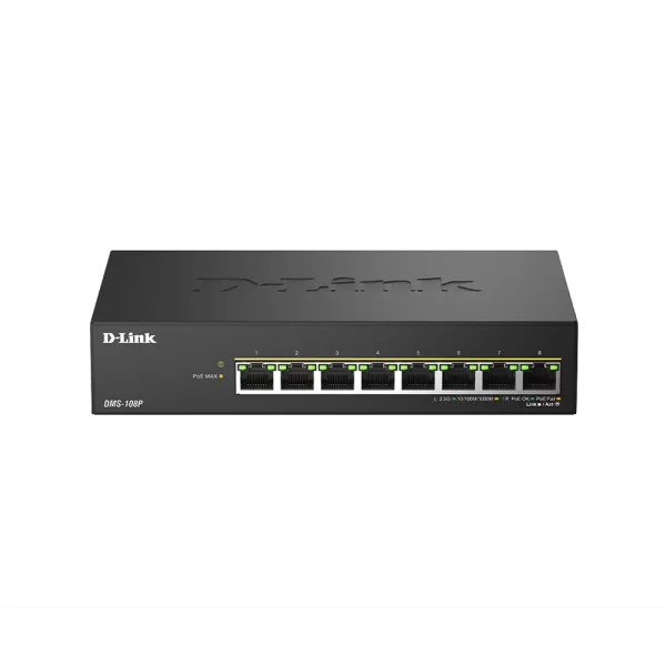 SWITCH D-Link 8 porturi 2.5G Multi-Gigabit Unmanaged PoE, IEEE 802.3af/at/bt PoE pana la 90W/port, 230W budget putere, carcasa metalica "DMS-108P" (timbru verde 1.5 lei)