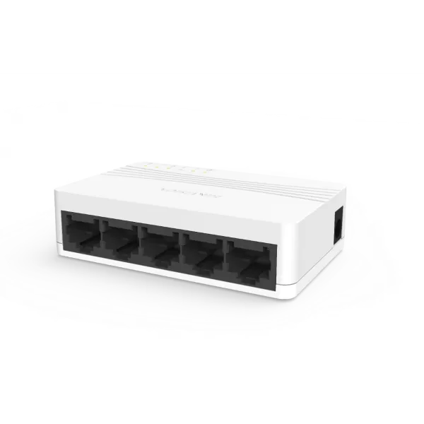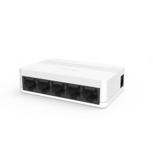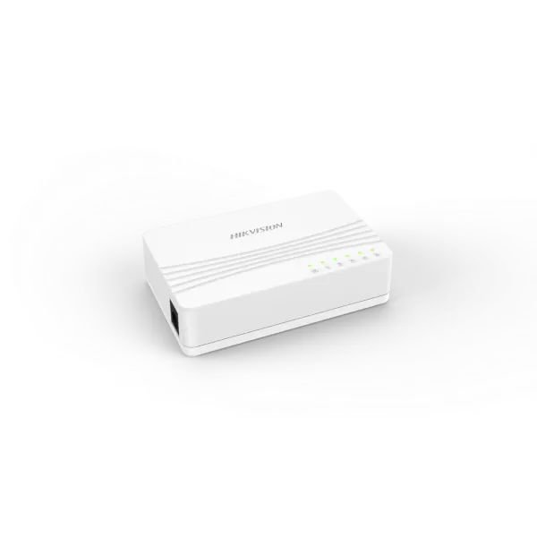 Switch 5 porturi Hikvision DS-3E0105D-E; L2, Unmanaged, 5 × 10/100 Mbps adaptive Ethernet ports, Plug & play, Support ADI/ADIX, Standard: IEEE 802.3, IEEE 802.3u, IEEE 802.3x, desktop plastic switch, material: ABS dimensiuni: 82× 52×22.4 mm, 0.025 kg