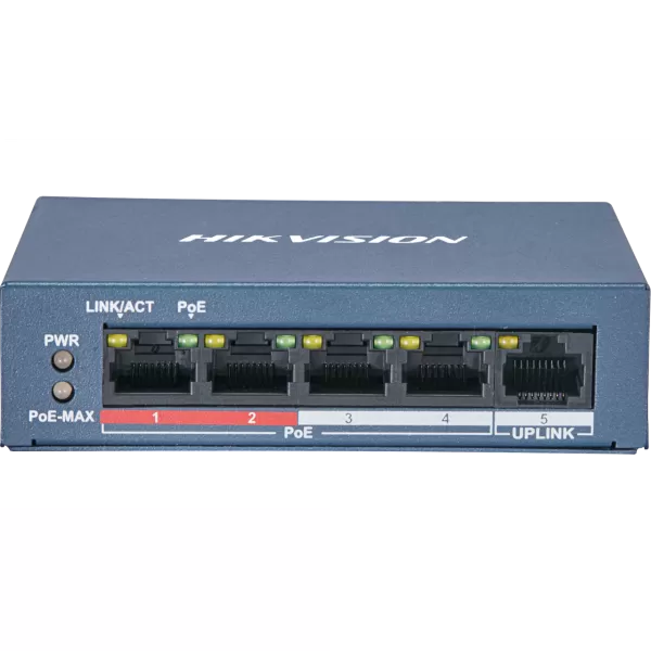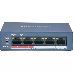 Switch POE 4 porturi Hikvision DS-3E0105P-E/M, fara management; 4x 100MPoE port, 1x 100M uplink port, 802.3af/at, PoE power budget 35W , distanta transmisie: 250m;