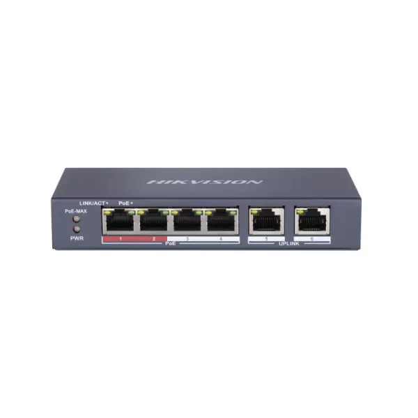Switch Hikvision DS-3E0106P-E-M, Switching capacity 1.6 Gbps, 4 x 10/100Mbps PoE ports, and and 2 × 10/100Mbps RJ45 ports, MAC address table 4 K, PoE power budget 35 W, Internal cache 768 Kbits, 6 KV surge protection for PoE ports, Up to 300 m long-range transmission, dimensiuni: 145 mm × 68.45 mm × 25.6 mm, temperatura de functionare: - 10°C to 40°C, greutate :0.52Kg.