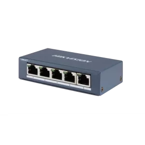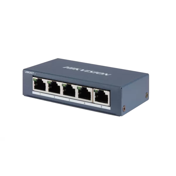 Switch 5 porturi Gigabit, Hikvision DS-3E0505-E, fara management, 5 x 1000M Ethernet ports, Supports IEEE 802.3, IEEE 802.3u and IEEE 802.3x, 1000M network access, RJ45 port, Full duplex, MDI/MDI-X adaptive, standard: IEEE 802.3, IEEE 802.3u, IEEE 802.3x, MAC Address Table: 2K, Switching Capacity 10Gbps, metal, dimensiuni: 103 mm × 25.6 mm × 61.1 mm, greutate: 0.15 kg