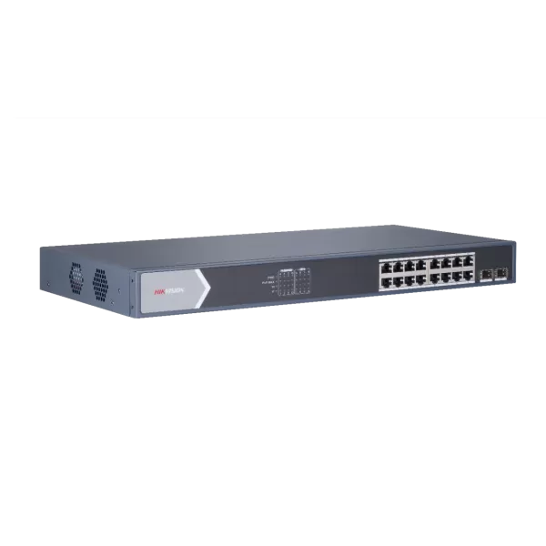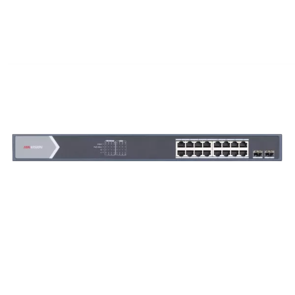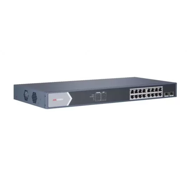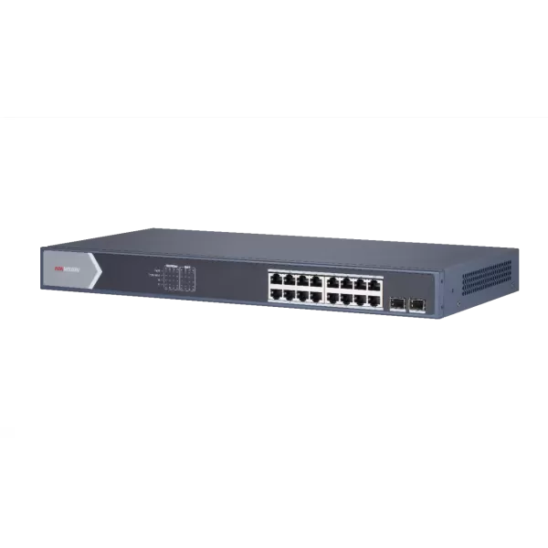 Switch 16 porturi PoE Gigabit Hikvision DS-3E0518P-E/M, L2, Unmanaged, 16 × Gigabit PoE ports, 2 × Gigabit SFP fiber optical ports, RJ45 port, full duplex, MDI/MDI-X adaptive, putere PoE 125W, maxim 30W per port, management putere PoE, capacitate: 36 Gbps, material metal, dimensiuni: 440 mm × 44 mm × 220.8 mm, greutate: 2.500 kg