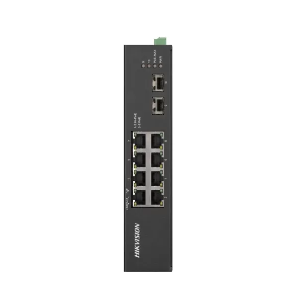 Switch Gigabit 8 porturi POE Hikvision DS-3T0510HP-E/HS, destinat pentru medii industriale, fara management, 6 × gigabit PoE RJ45 ports( putere 30W- port 3-8), 2 × gigabit Hi-PoE RJ45 ports ( putere 90W-port 1 si 2) and 2 × gigabit SFP fiber optical ports, distanta de transmitere pana la 300 metri pe porturile 7 si 8, PoE watchdog auto detect si restarteaza camerele care nu raspund, protectie 6KV la descarcari electrice, temepratura de functionare: -30 la 65 °C, dimensiuni: 197 mm × 114.2 mm × 42.2 mm, greutate: 0.585 kg