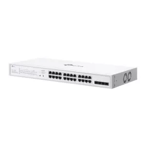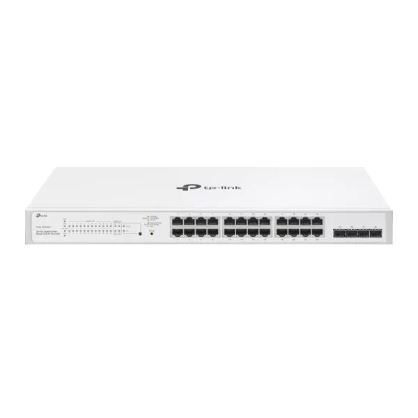 Switch TP-Link cu 28 de porturi, 24× Gigabit 802.3af/at PoE+ ports si 4× Gigabit SFP slots, capacitate switch 56 Gbps, dimensiuni 17.3×8.7×1.73 in (440×220×44 mm)
